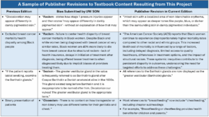 - A publisher of a widely used textbook in schools of nursing and medicine across the US and internationally agreed to address all 17 instances of bias submitted from students, staff and faculty in the 2023-2024 academic year in future editions of the textbook. This publisher also requested ongoing feedback from our project regarding additional instances of bias submitted.